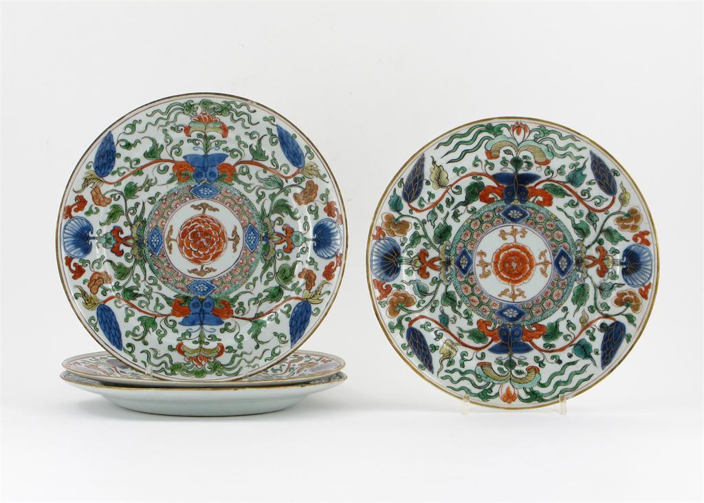 A set of four Chinese famille verte plates, decorated with butterflies, flowers and foliage, Kangxi 1662-1722, tiny rim chips, 23cm. (4)