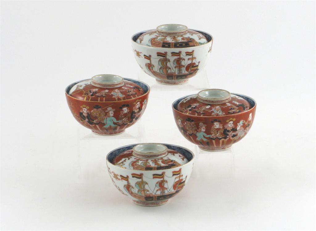 A set of four Japanese 'Black Ship' bowls and covers, each painted with European figures and ships in the Kutani palette, 19th century, 11.5cm. (8)