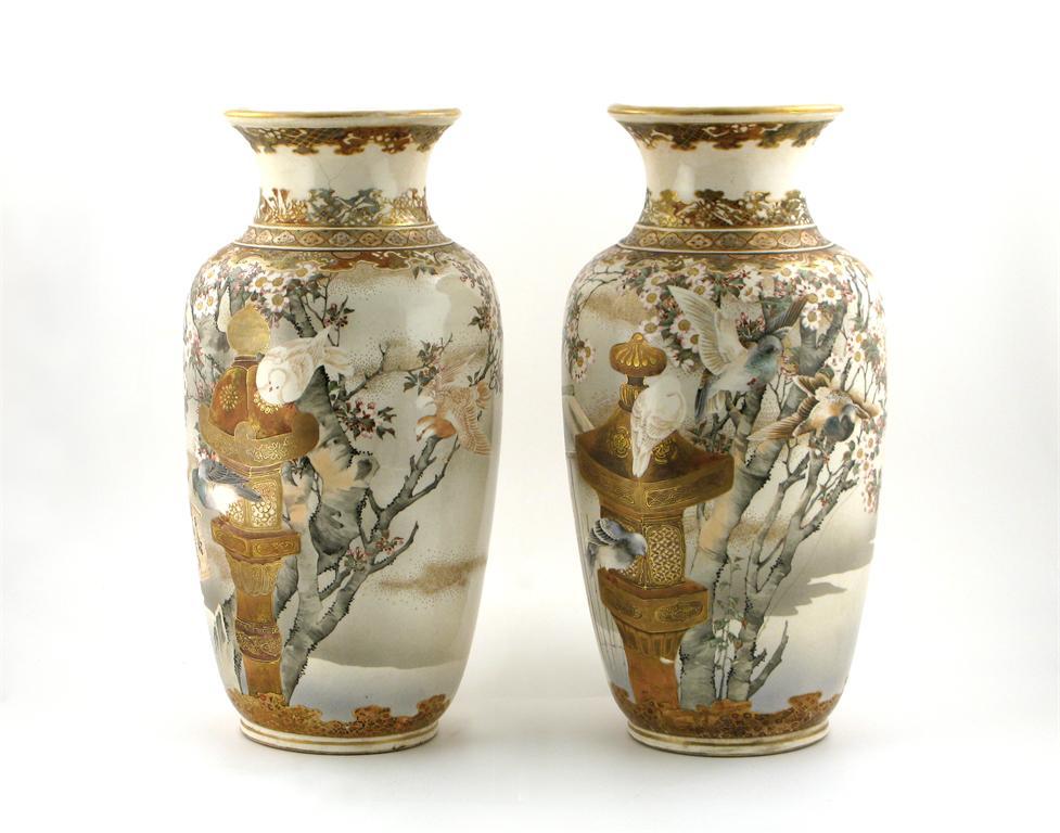 A large and dated pair of Japanese Satsuma vases, from the Kinkozan workshop, each decorated with doves and flowering trees, one with a panel inscribed with the date corresponding to 1888, wear and damages, 46.5cm. (2)