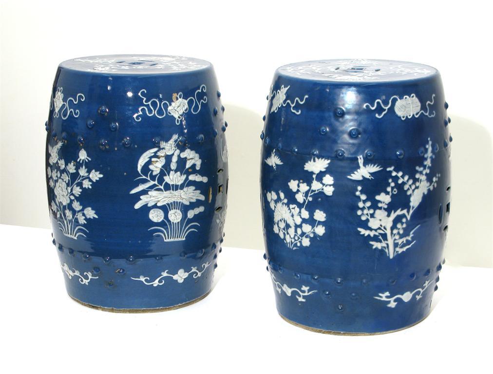 A pair of Chinese barrel-shaped garden seats, decorated with sprays of flowers, birds and auspicious symbols, in white slip on a blue ground, 19th century, one with restoration, 45cm. (2)