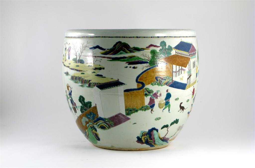 A large Chinese rose-verte jardinière, brightly painted with a kiosk by a lily pond, a farmyard scene, mountains, trees and a multitude of figures, restoration, 19th century, 46cm.