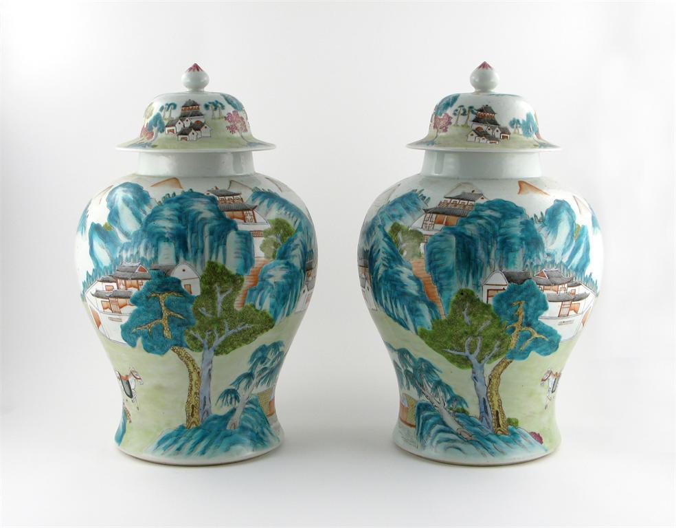 A large pair of Chinese Canton famille rose baluster vases and covers, each painted with a continuous scene of pagodas among rocky mountains, the covers similarly decorated, 19th/20th century, 43.2cm. (4)