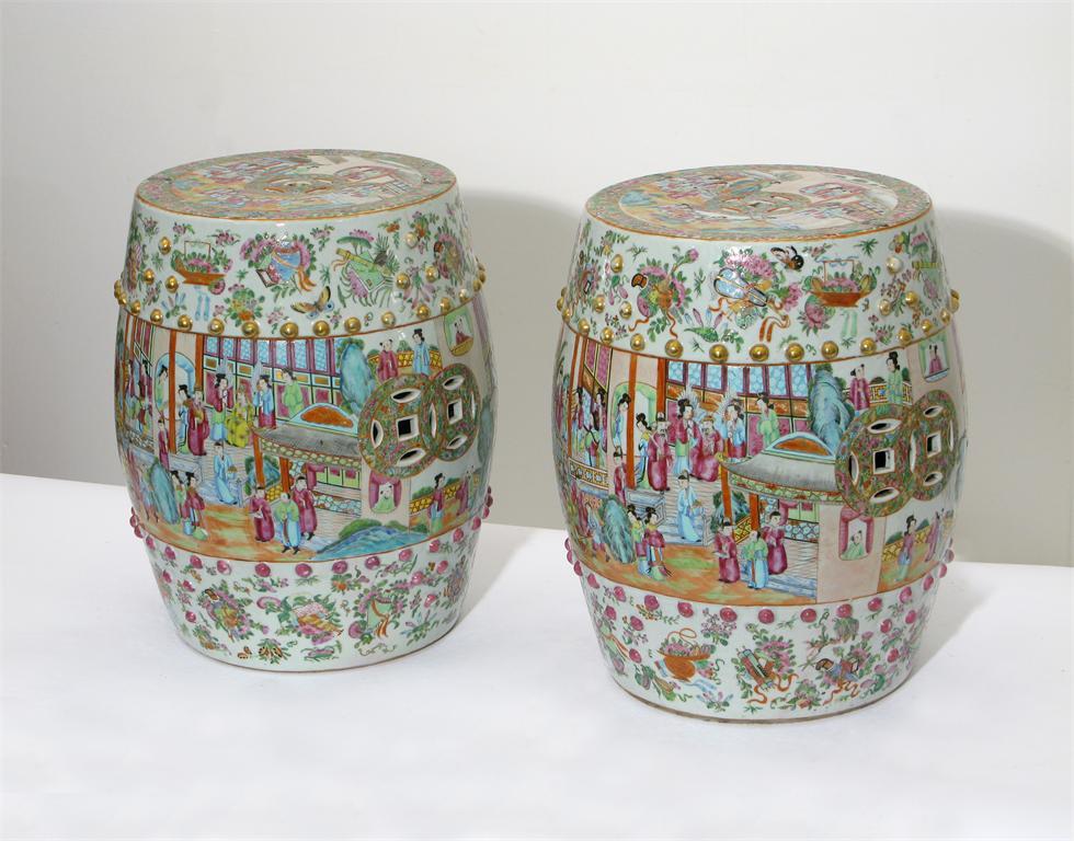 A pair of Chinese Canton famille rose barrel-shaped garden seats