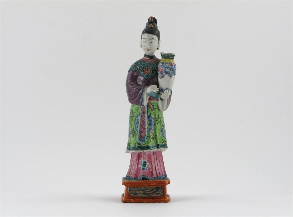 A Chinese famille rose standing figure of maiden, wearing a brightly coloured robe and holding a vase, 18th century, minor repair to the vase, 26.5cm.