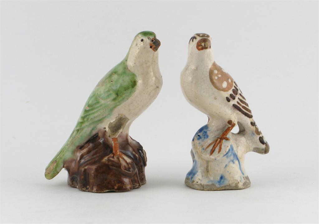 Two Chinese pottery models of birds, perched on rocks, one with green plumage the other brown, wear and glaze flaking, 10.2cm. (2)