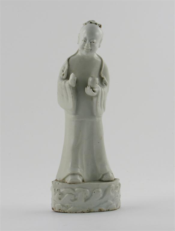 A Chinese moulded white-glazed figure of a man, smiling and holding a cup in his left hand, raised on a base with breaking waves, 18th/19th century, some damage to his right hand, 21.5cm.