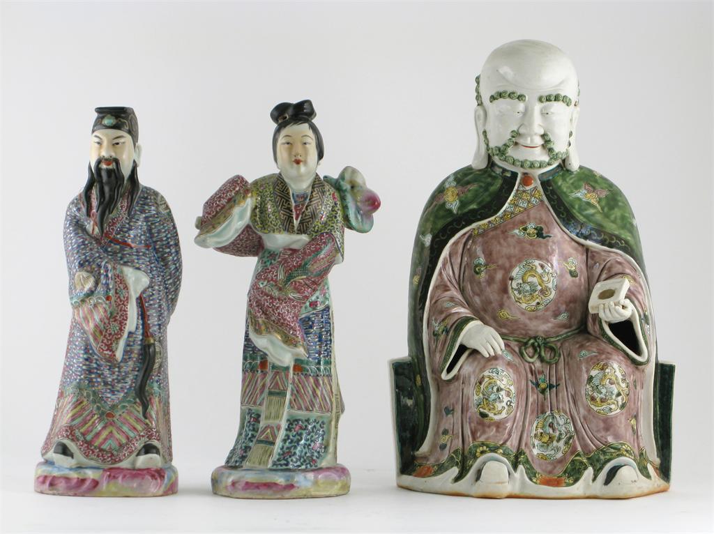 A pair of famille rose figures, of a sage and his companion, each wearing elaborate colourful robes, and an enamel on biscuit model of a seated scholar, 19th/20th century, minor faults, 41cm. (3)