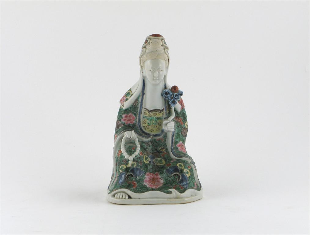 A Chinese rose verte seated model of Guanyin, holding a ruyi sceptre and a string of beads, her robes painted with butterflies, flowers and leaves, mid 18th century, restoration to one hand, 22cm.