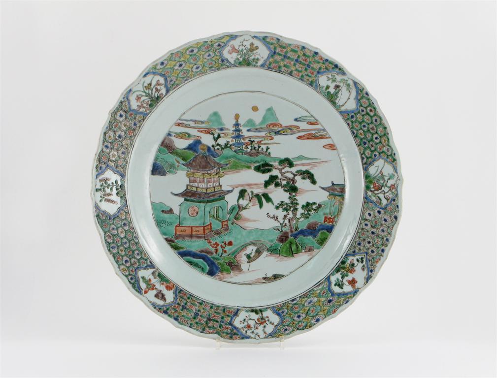A large Chinese famille verte plate, brightly painted with a small figure in a boat in an extensive watery landscape with three pagodas, a pine tree and the setting sun, the border with eight panels containing differing flowering bushes on a complex diaper band, the reverse with an artemesia leaf mark, Kangxi 1662-1722, the centre with a restored drill hole, 38.5cm.