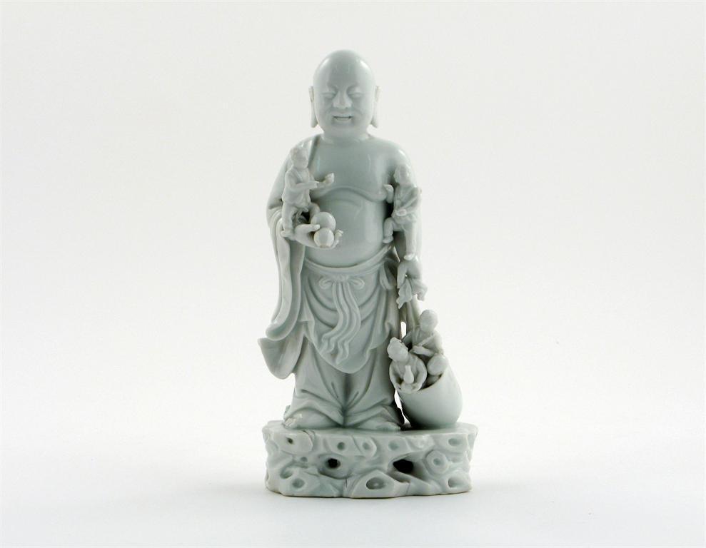A Chinese blanc de Chine figure of Budhai Ho Shang, the patron saint of children, standing holding a gourd and a sack overflowing with small figures, raised on a rocky base, probably early 18th century, a chip to the end of his gourd, 20cm.