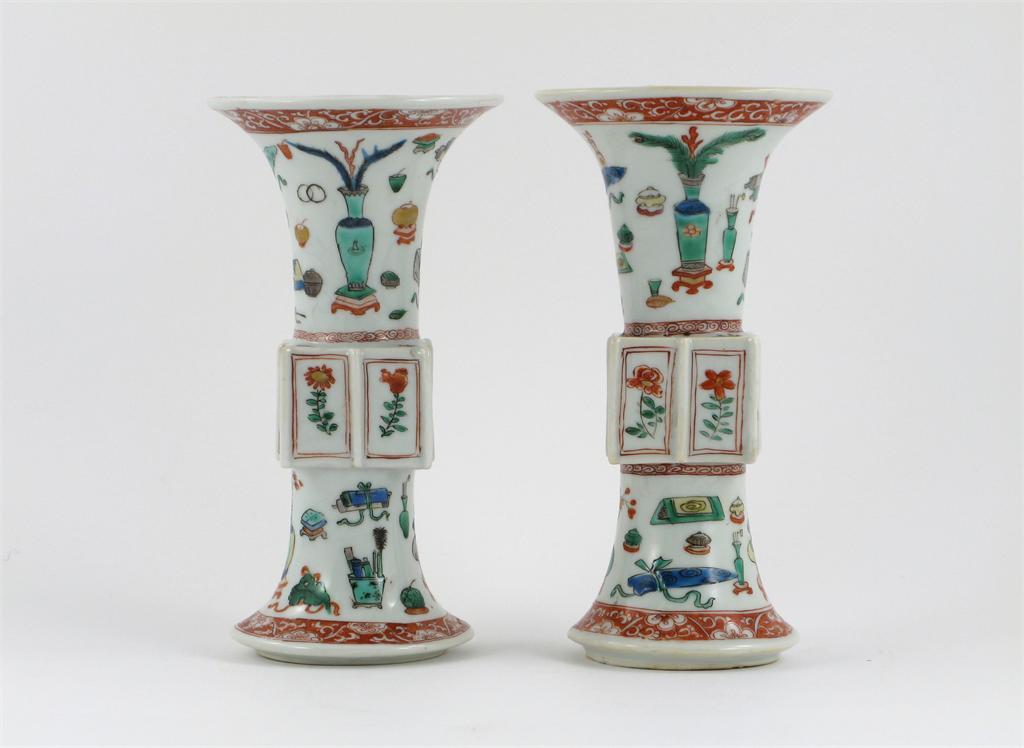 A pair of Samson famille verte gu-shaped vases, the bodies decorated with the po ku, the borders painted as flowers and scroll work in iron red, 19th century, some restoration, 20cm. (2) Cf. Lot 768 of this sale for the Kangxi originals.