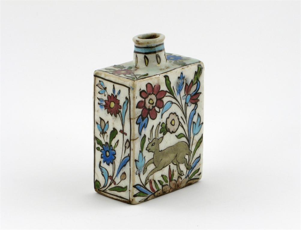 A Middle Eastern pottery square-section flask, decorated with running hares, flowers and foliage, c.1900, 15.5cm.