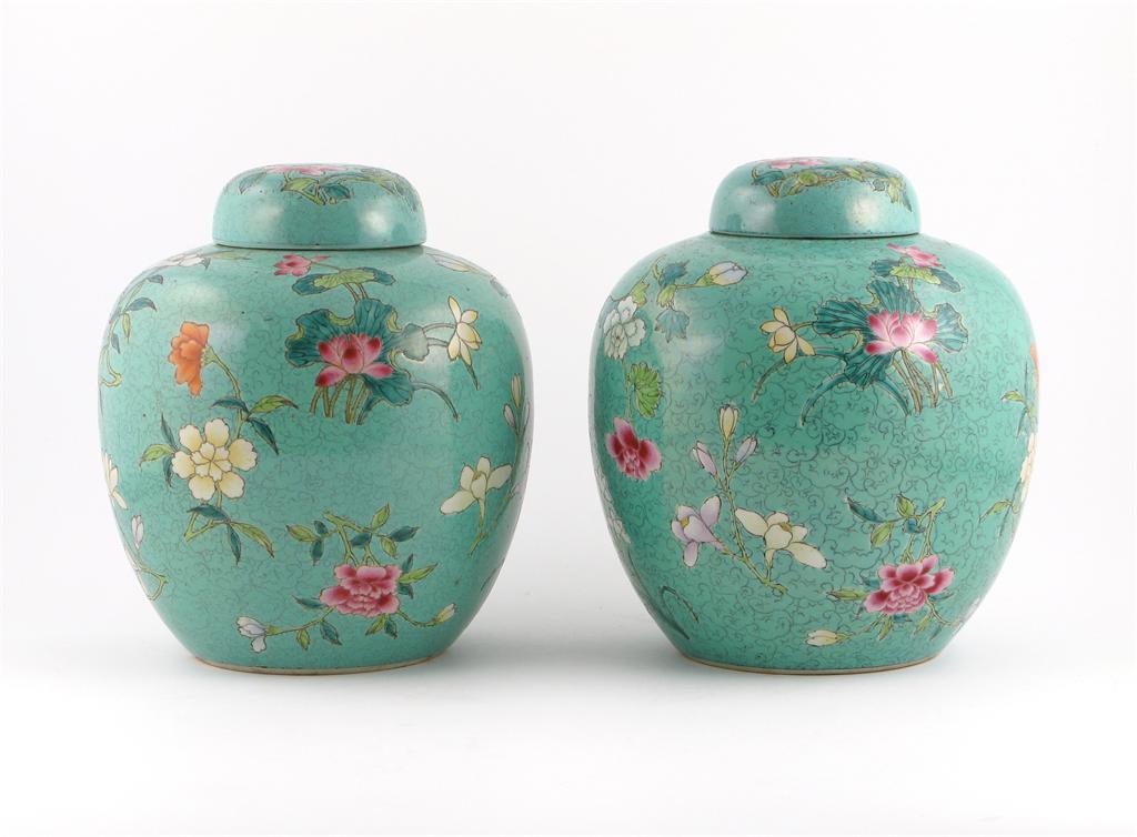 A pair of Chinese ovoid vases and covers, painted in the famille rose palette with flower sprays on a turquoise green scrolling ground, 19th/20th century, minor damage, 24cm. (4)
