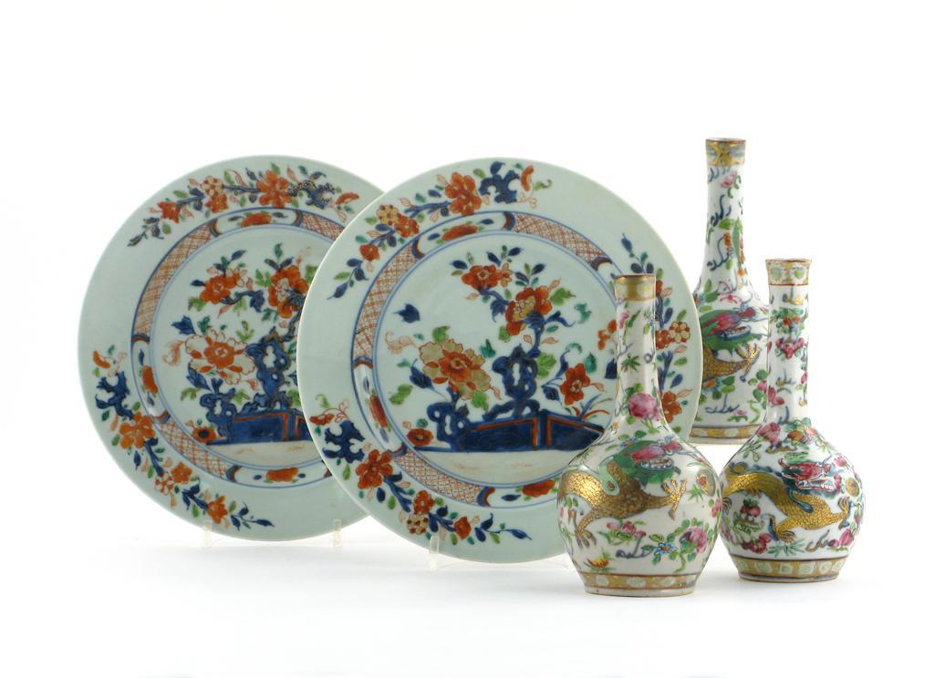 Three Chinese bottle vases, later enamelled with dragons, butterflies and flowers, and two Chinese Imari plates, decorated with flowers and rockwork, 18th and 19th centuries, some damages, 22.5cm. (5)