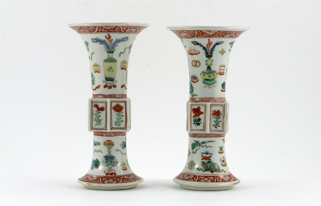 An unusual pair of Chinese famille verte gu-shaped vases, the central sections formed as cubes, the bodies decorated with the po ku, the borders painted as flowers and scroll work in iron red, Kangxi 1662-1722, both with foot rim chips, one with a 3cm crack, 20.5cm. (2)