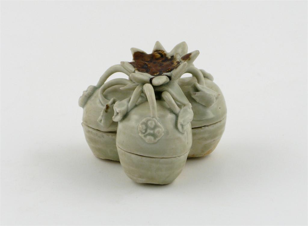 An unusual Qingbai cosmetic box and cover, formed as three fruits, beneath and elaborate knop formed as a lotus flower with tendrils and leaves, probably Northern Song dynasty, 6.8cm. (2)