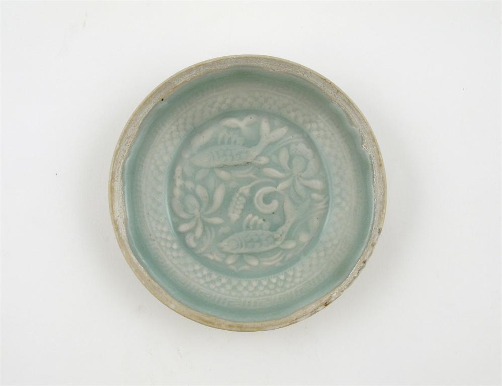 A Chinese Qingbai small stoneware dish, modelled with two scaly fish amidst lotus, Southern Song or Yuan dynasty, 13th century, 10.5cm. Cf. Regina Krahl, Chinese Ceramics from the Gulexan Collection, no.53 for a similar example.
