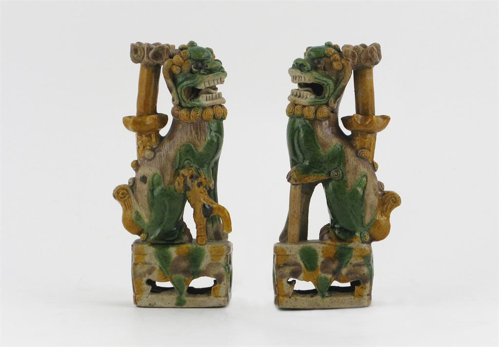A pair of Chinese models of lion dogs, each enamelled on the biscuit in green, yellow and aubergine, Kangxi 1662-1722, restoration and losses, 15.5cm. (2)