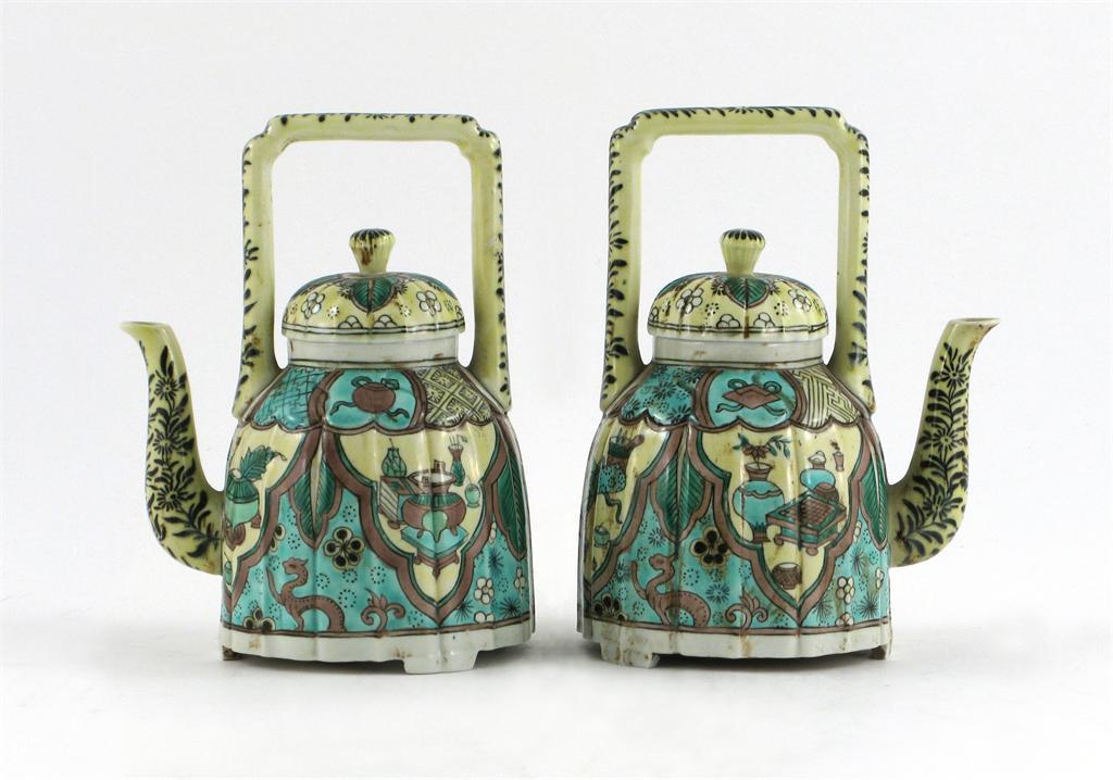 A pair of Samson famille jaune ewers and covers, the ribbed bodies painted with panels containing vases and auspicious objects, 'S' marks, 19th century, some restoration, 17cm. (4)