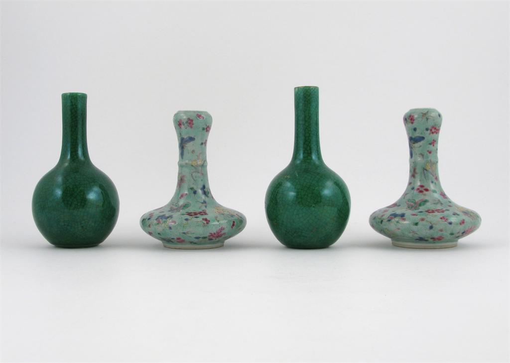 Four small Chinese green ground vases, two with a crackle glaze, the others painted with butterflies and flowers, 19th century, 13cm. (4)