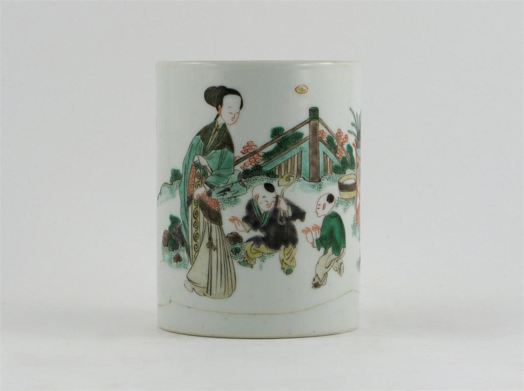 A Chinese famille verte cylindrical brushpot, painted with two children playing in a garden, attended by their mothers, the reverse with calligraphy, Kangxi 1662-1722, cracked around the base and glued, 13.5cm.