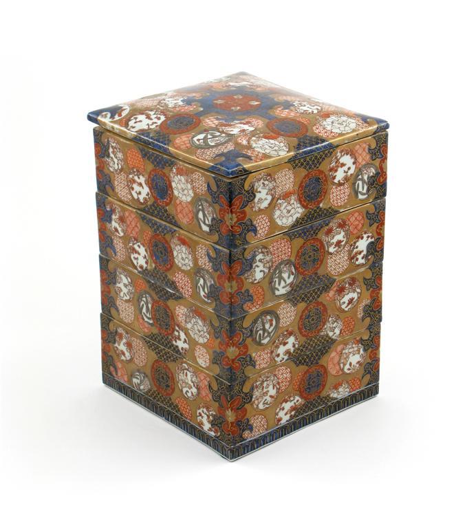 A Japanese Imari stacking box and cover, with four sections decorated with circular panels and flowers and diaper designs, c.1900, 25.5cm high. (5)