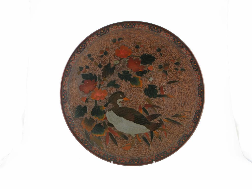 A large Japanese lacquered porcelain dish, decorated with a mandarin duck amidst flowers and foliage, 19th century, 47cm.
