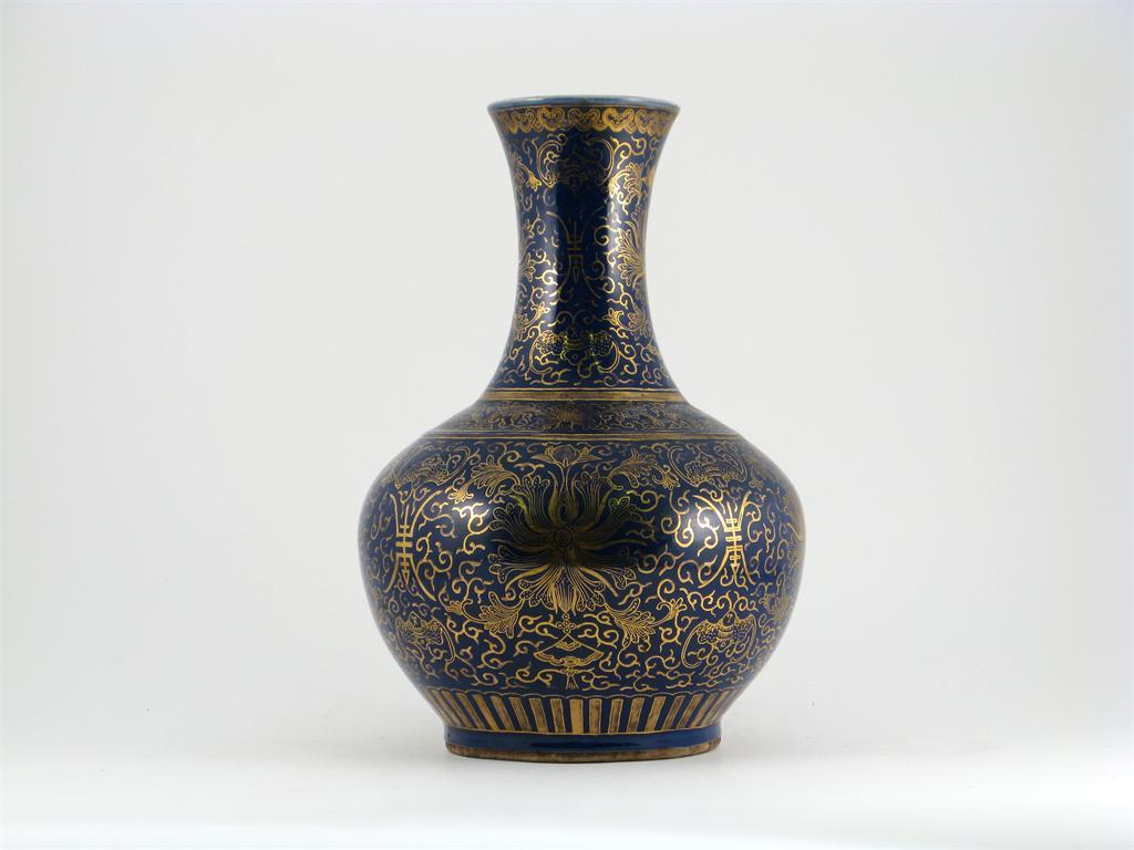 A Chinese blue-glazed bottle vase, gilt decorated with lotus flower heads, divided by shou characters between bands of bats and peaches, unmarked, 19th/20th century, a little wear to the gilding, 34.5cm.