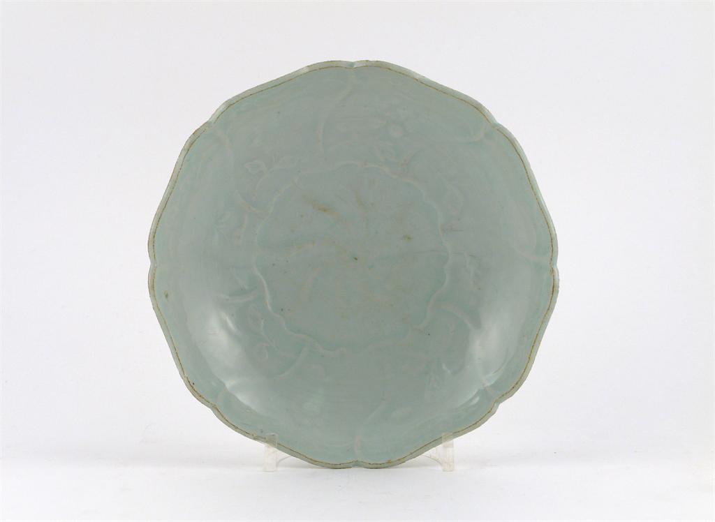 A Chinese Qingbai mallow-shaped dish, moulded with a central spiral motif and with eight radiating panels containing differing flower sprays, Song/Yuan dynasty, 17cm.