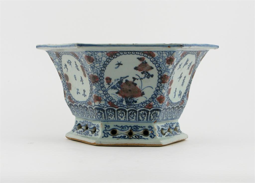 A Chinese blue and underglaze red hexagonal jardinière