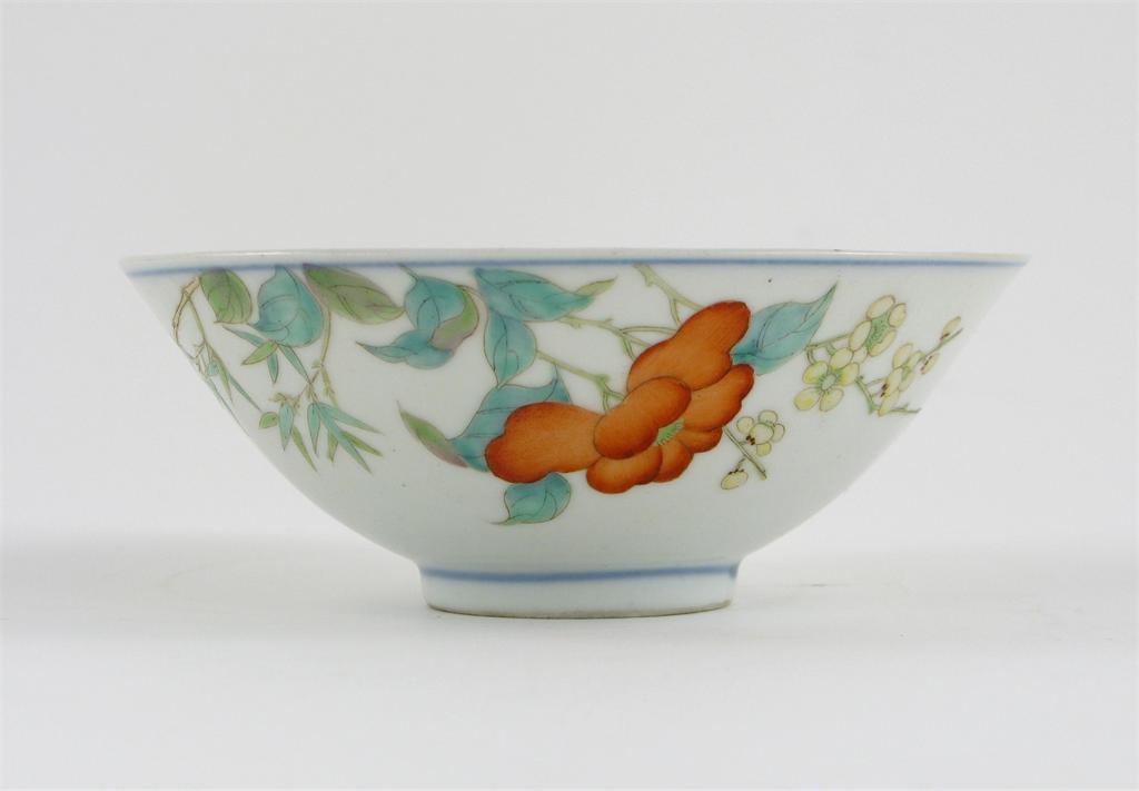 A small Chinese bowl, the exterior painted with a flower spray, prunus and bamboo, the base with a six character Chenghua mark, but modern, 12cm.