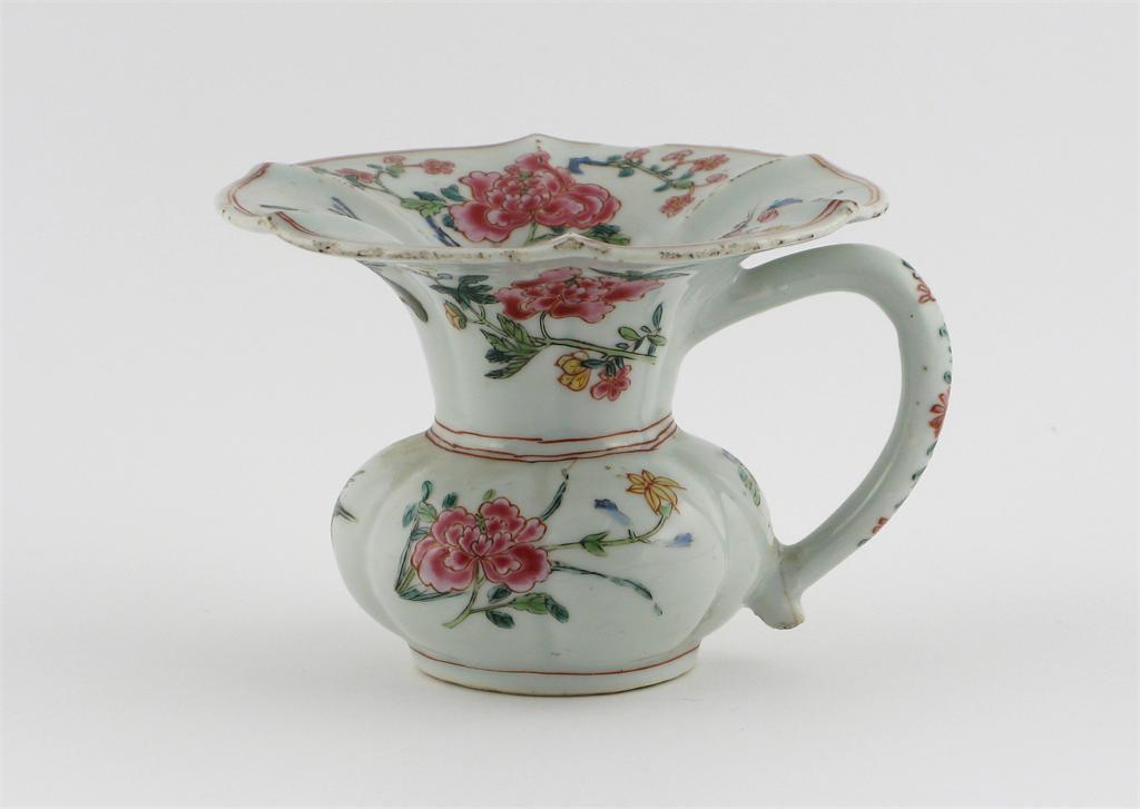 A Chinese famille rose zhoudou, with a lobed body painted with a kingfisher and other birds, amidst peony sprays, 18th century, chipped and cracked, 14.5cm.