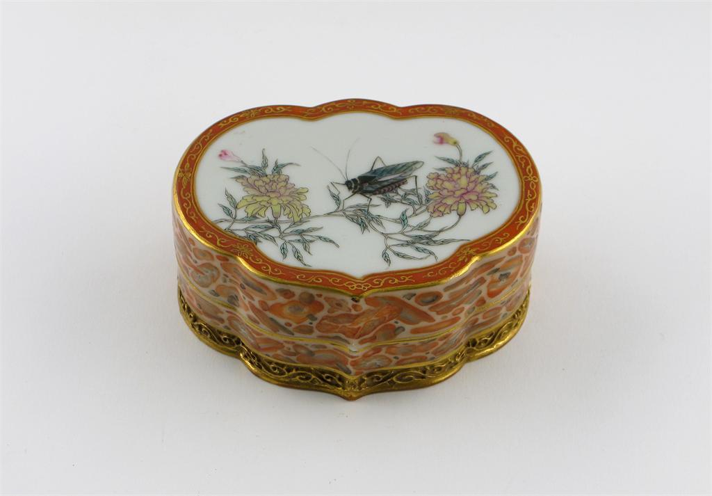 A Chinese ruyi-shaped box and cover, painted with a large cricket on a peony spray, the sides with orange marbling above a moulded band of gilt scrollwork, the gilt base with an impressed six character Qianlong mark but 20th century, 11cm. (2)