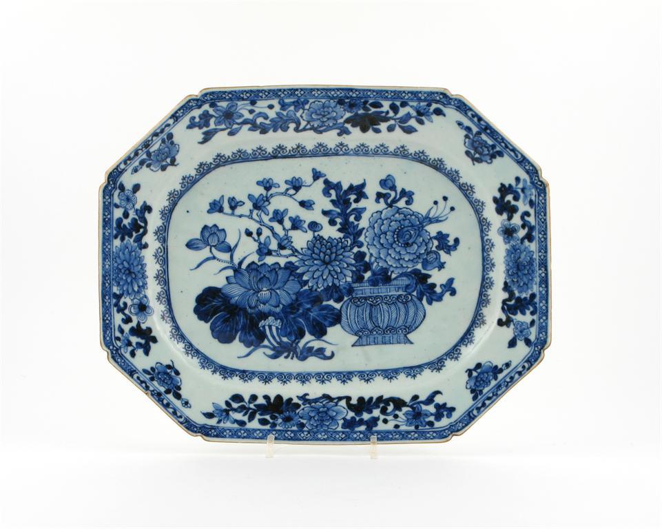 A Chinese blue and white octagonal meat plate, painted with peony, magnolia and chrysanthemum, Qianlong 1736-95, a tiny rim chip, 32.8cm.