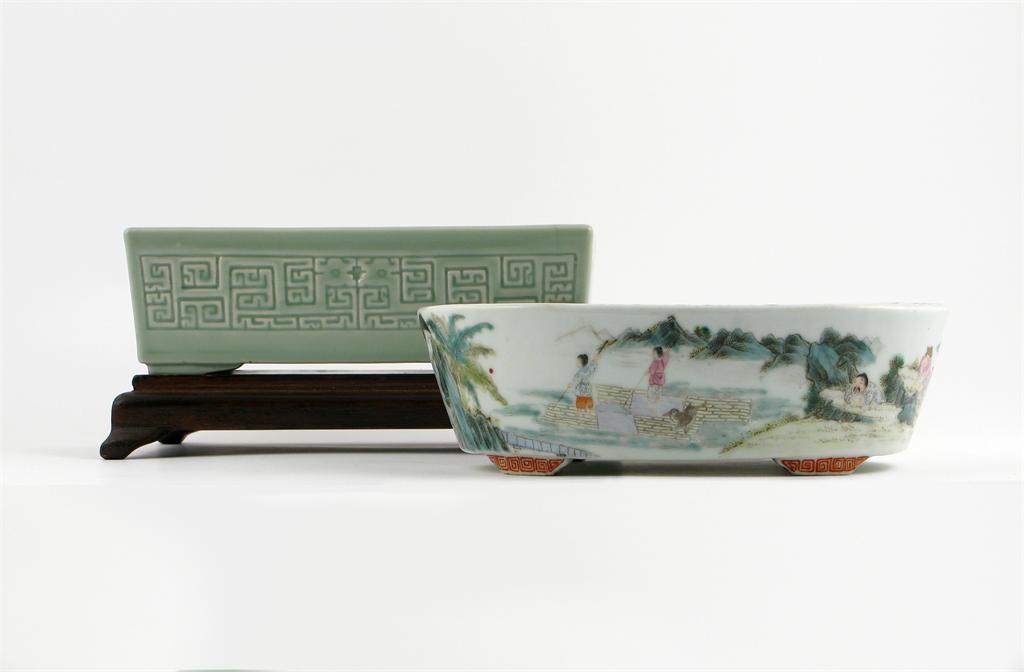 Two Chinese shallow jardinières, one painted in the famille rose palette with figures in a landscape, the other celadon moulded with taotie masks, both with six character Qianlong marks, 19th century, some damage, 23.5cm max. One with a wood stand. (3)