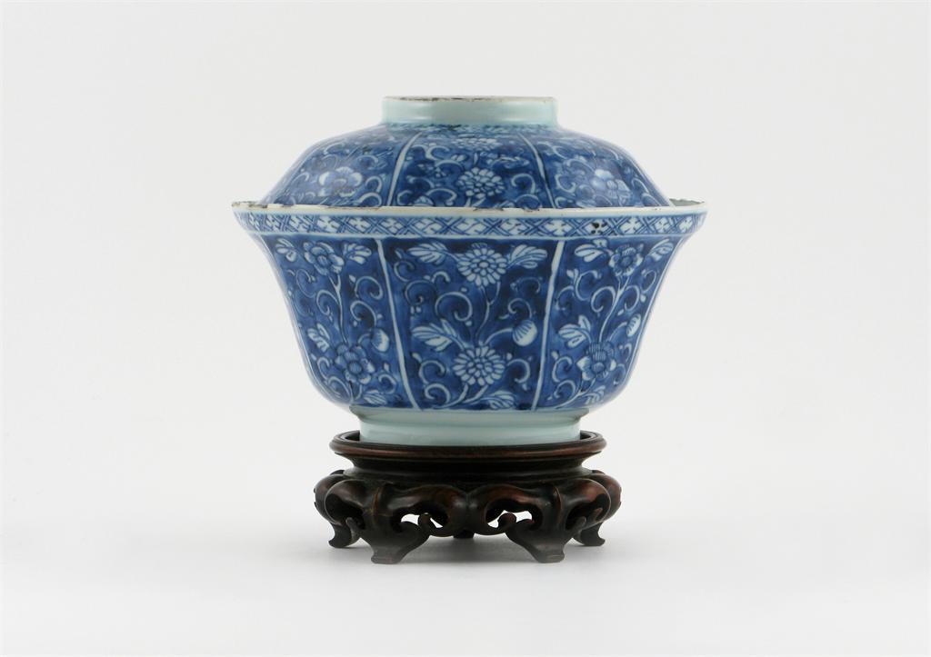 A Chinese blue and white bowl and cover, painted with panels containing flowers, Kangxi 1662-1722, the rims fritted, the stand damaged, 15.1cm. Together with a hardwood stand. (3)
