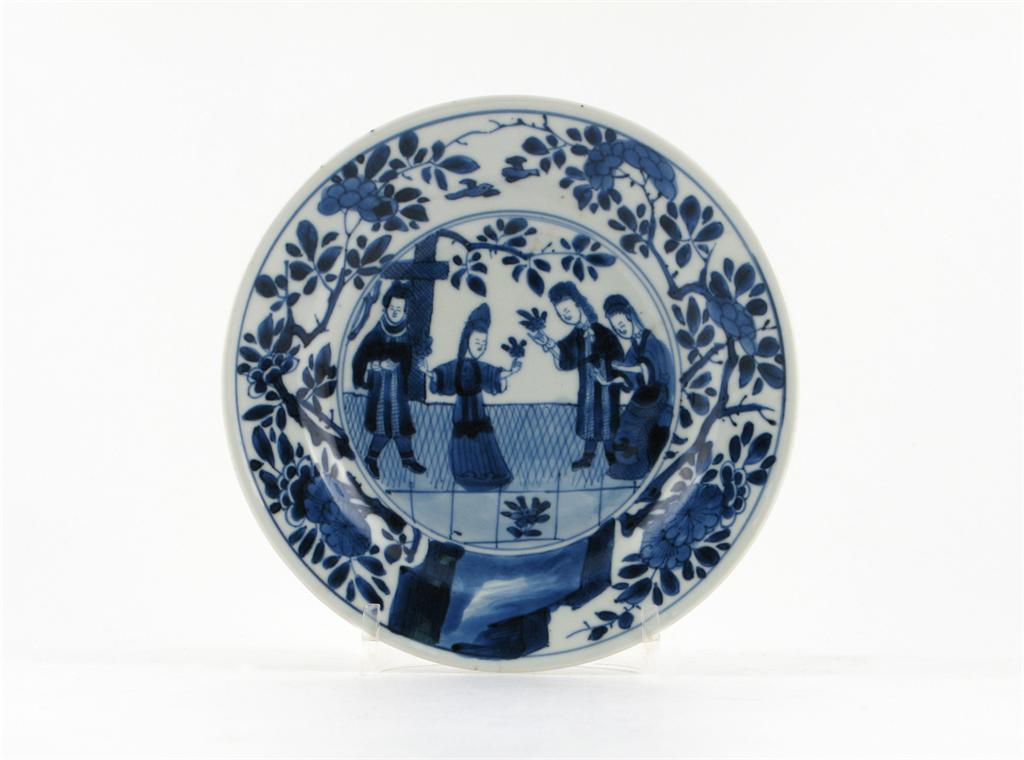 A small Chinese blue and white plate, painted with a central scene after a European print illustrating the genteel pastime of guessing the name of flowers by their scent; possibly the sense of smell, all within a border of flowering branches, the base with an artemesia mark, Kangxi 1662-1722, a faint 2cm hairline crack, 15.5cm.