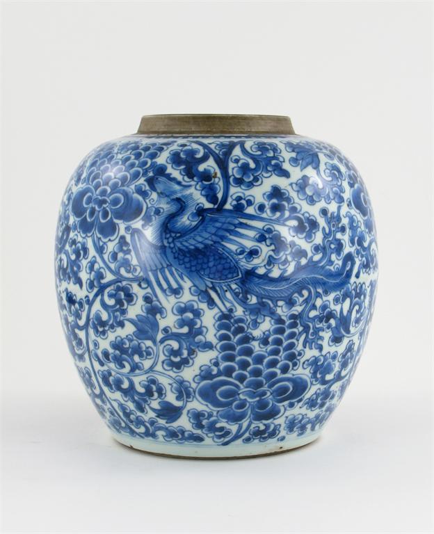 A Chinese blue and white ovoid vase, painted with three phoenix amidst continuous peony scrolls, Kangxi 1662-1722, minor fritting to the neck rim, 21cm.