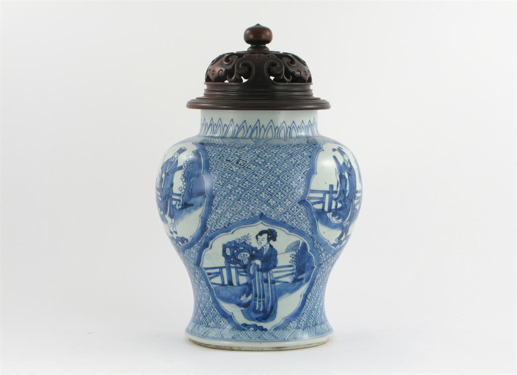 A Chinese blue and white baluster vase, painted with six shaped panels containing figures in various pursuits on a diaper ground, Kangxi 1662-1722, cracks to the base, a wooden cover, 32cm overall. (2)