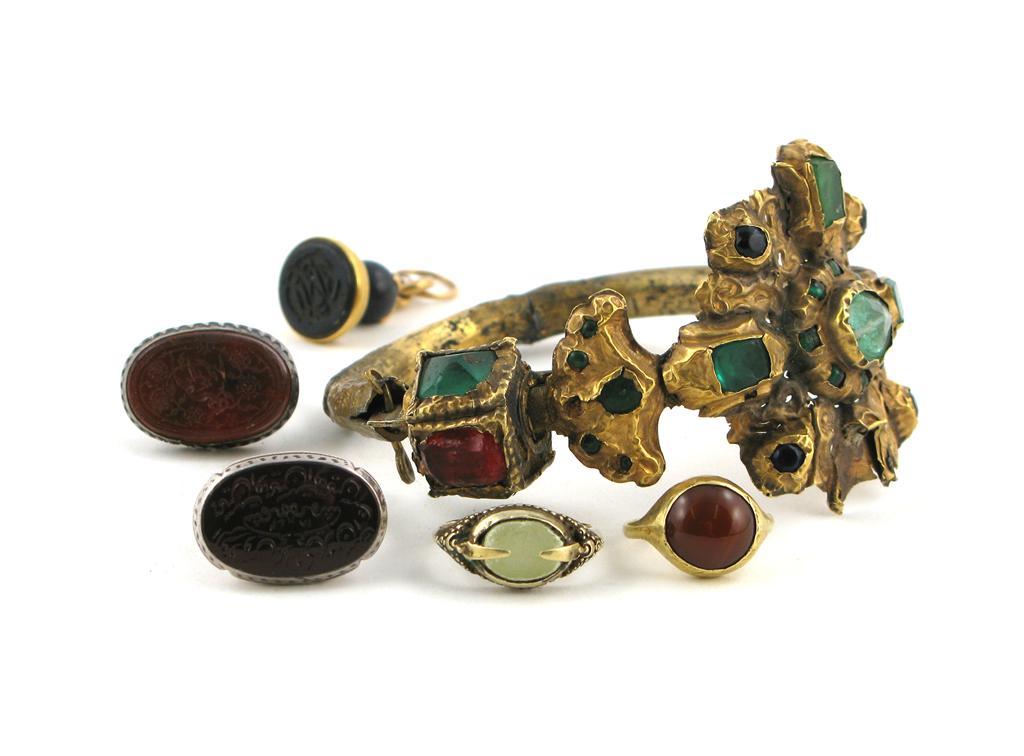 An Indian gilt metal bracelet, inset with semi-precious stones, together with two Middle Eastern rings, two further rings and a seal, damages and wear. (6)