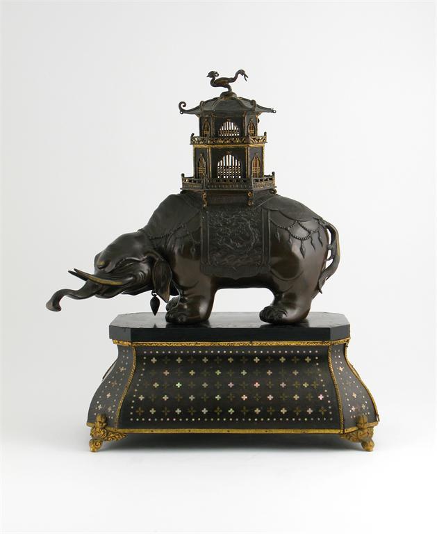 A Chinese bronze elephant incense burner, standing with his head lowered and with a detachable pagoda on his back, all raised on a wood stand inset with mother of pearl and brass with geometric motifs, 20th century, some gilt wear and minor losses, overall height 55cm. (2)