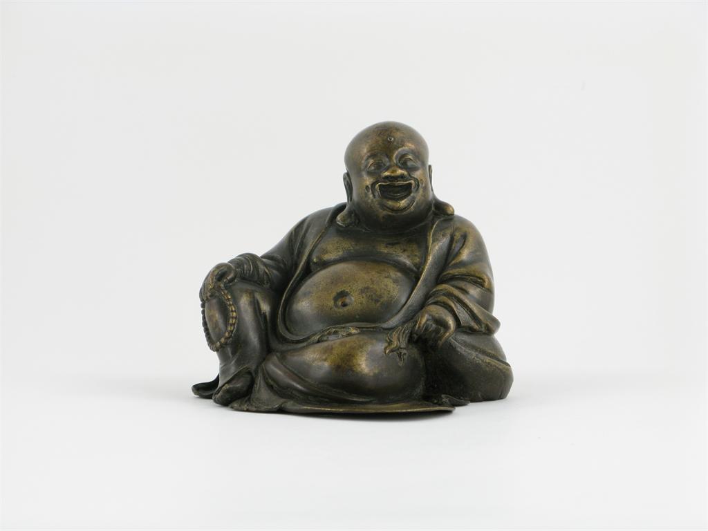 A Chinese bronze seated figure of Budai Ho Shang, holding the mouth of his hempen bag with his left hand, his right hand resting on his knee, 17th/18th century, some damages, 13.7cm.