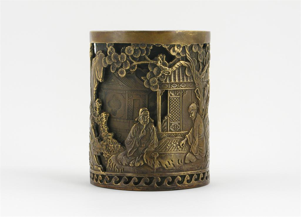 A Chinese bronze double-walled brushpot, decorated with four figures, two playing Go beneath a pine tree, the others walking in a mountainous landscape, the base with a sixteen character mark, 12.9cm.