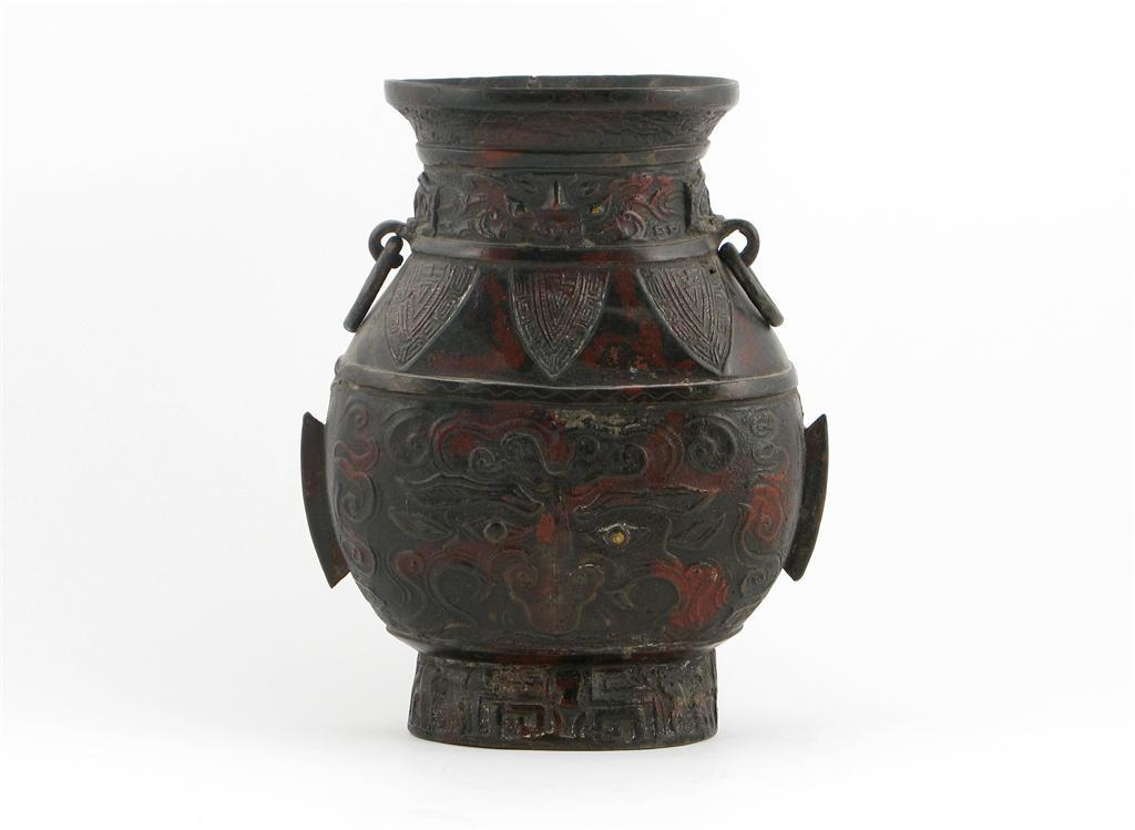 A Chinese bronze archaic style vase, with loose ring handles, the body cast with taotie masks, 17th century or later, corrosion and surface damage, 24.5cm.