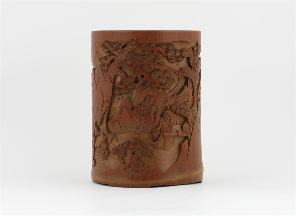 A Chinese bamboo brushpot, carved with figures seated beneath pine and banana trees in a rocky landscape, the reverse with calligraphy, 15.5cm.