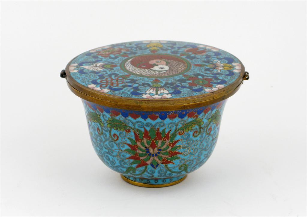 A Chinese cloisonné circular box and cover, decorated with carp encircled by Buddhist emblems, the body decorated with lotus flower heads on a turquoise ground, 19th century, hinge and catch damaged, 11.5cm. (2)