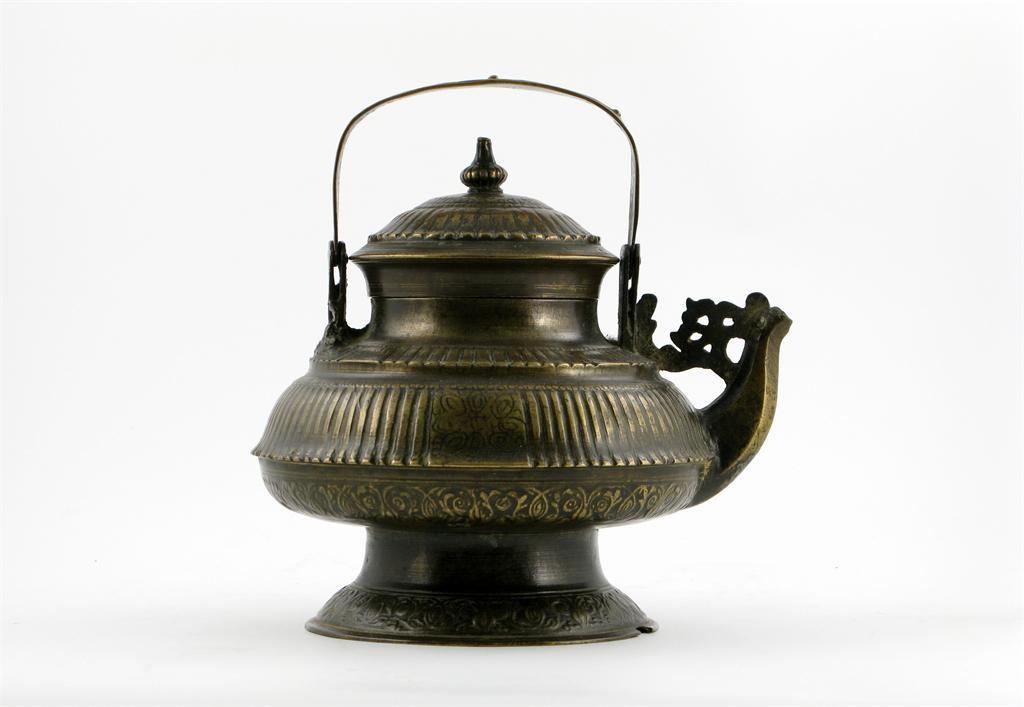 A South East Asian brass Kiri or kettle and cover, probably Brunei, cast with bands of belah rotan (split bamboo) and raised on a flared foot, 19th century, end of the spout lacking, 24cm. (2)