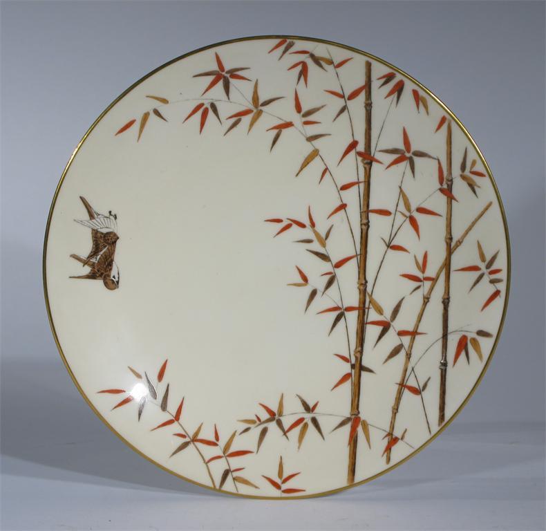 A Mintons Aesthetic Movement plate printed and enamelled with birds flying before bamboo...