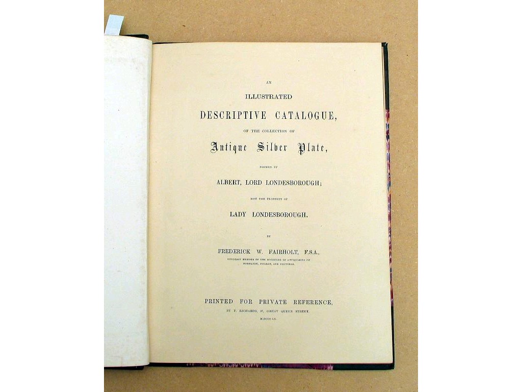 Fairholt, F.W: An Illustrated, Descriptive catalogue of the collection of Antique Silver Plate formed by Albert, Lord Londesborough, Now the property of Lady Londesborough, printed for private reference - 1860 gilt tooled half leather bound with marbled boards and bound with a letter from the author.