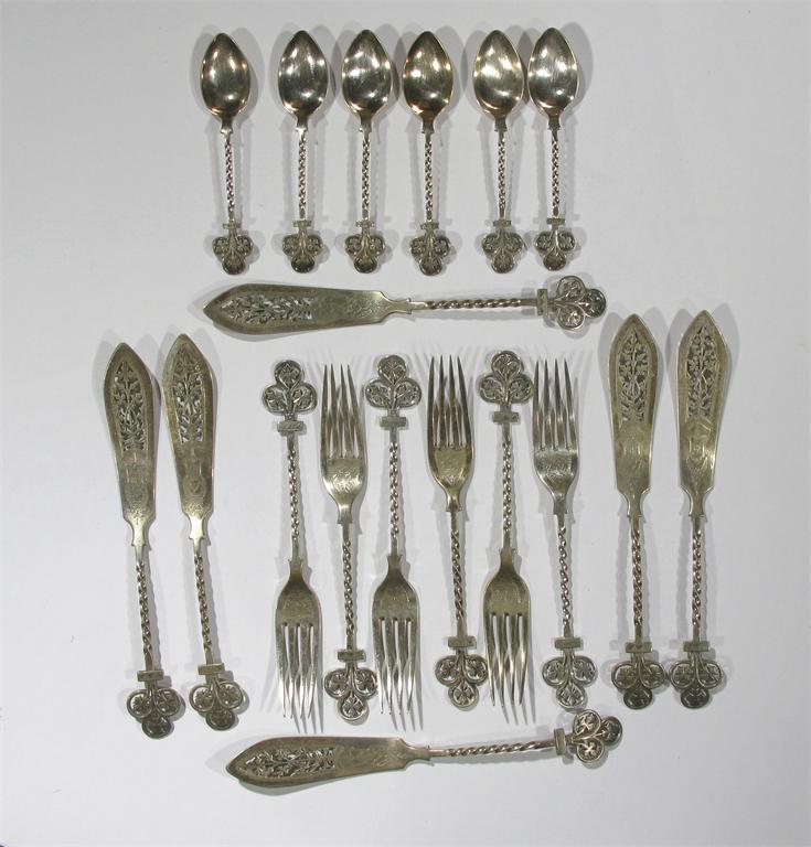 A Gothic Revival J A Rhodes electroplate part service comprising six fish-knives and forks